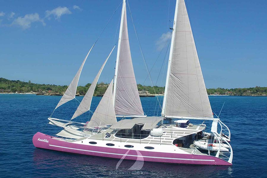 Bali Aneecha Catamaran adalah pelayaran Bali dengan catamaran Bali yang mewah. Aneecha adalah nama yacht yang menampung hingga 40 orang. Dengan Aneecha Sailing Catamaran, Anda akan dibawa untuk menikmati berbagai fasilitas di Pulau Lembongan. Snorkeling, tur desa, atau sekedar bersantai, Anda akan mendapatkan relaksasi akhir dengan catamaran mewah ini. Ini adalah pilihan paling populer dalam memiliki kapal pesiar pribadi dengan hanya beberapa penumpang di antara pasangan selama bulan madu di Bali.